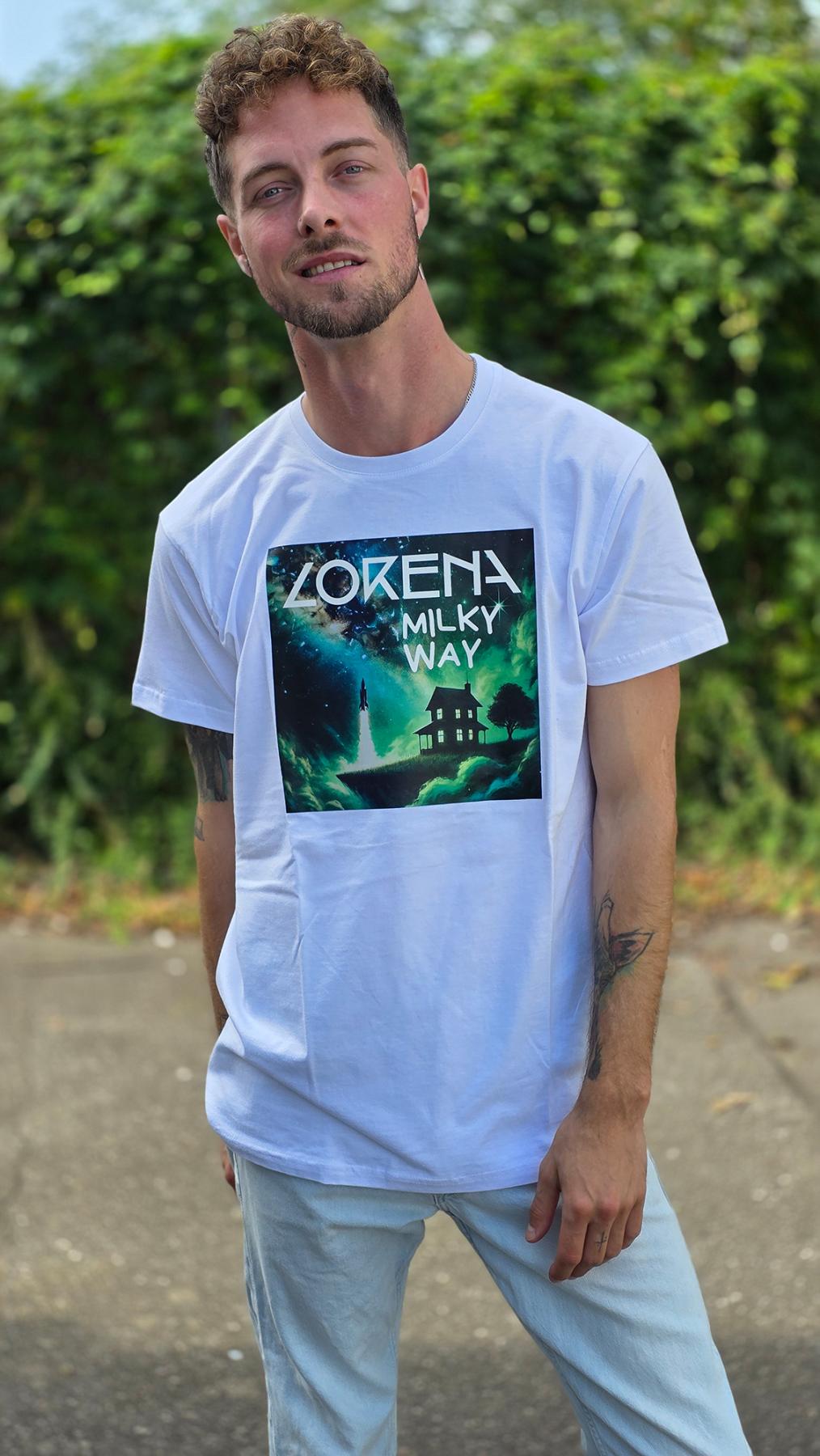 Weißes B&C Shirt Fotoprint Milky WayUnisexNic ist 183 cm groß und trägt die Größe L